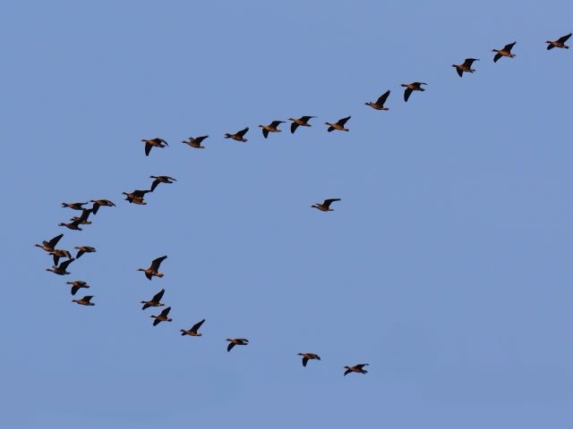 群れで飛ぶときにV字型の配置となる雁行(がんこう)は、2番目以降の鳥にとって空気抵抗を抑える効果があります。 ときどき先頭を交代しながら、長い距離を飛行します。