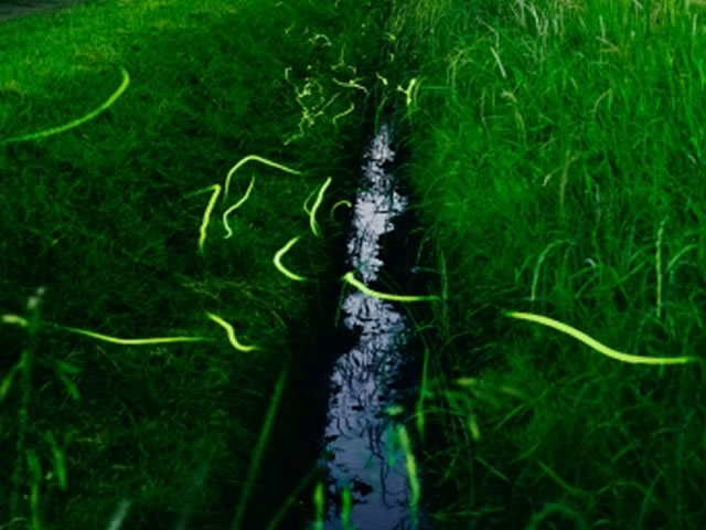 土から這い出てふわりと飛び立つホタルは、水辺の枯れ草から生まれるようにも見えます。 成虫になってからは水しか飲まず、約10日ほどでその命を終えます。